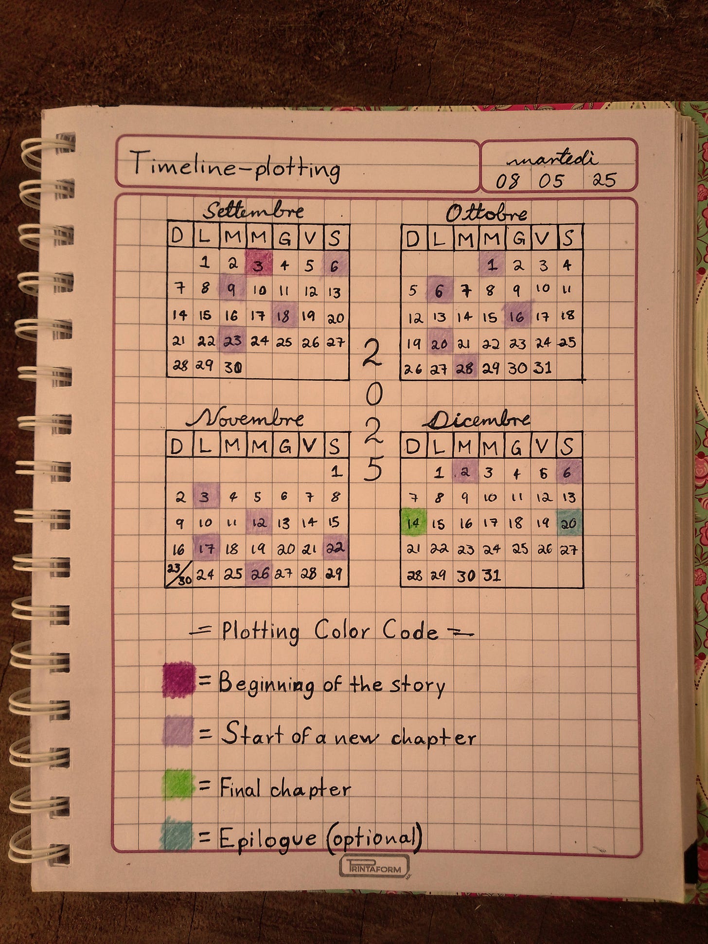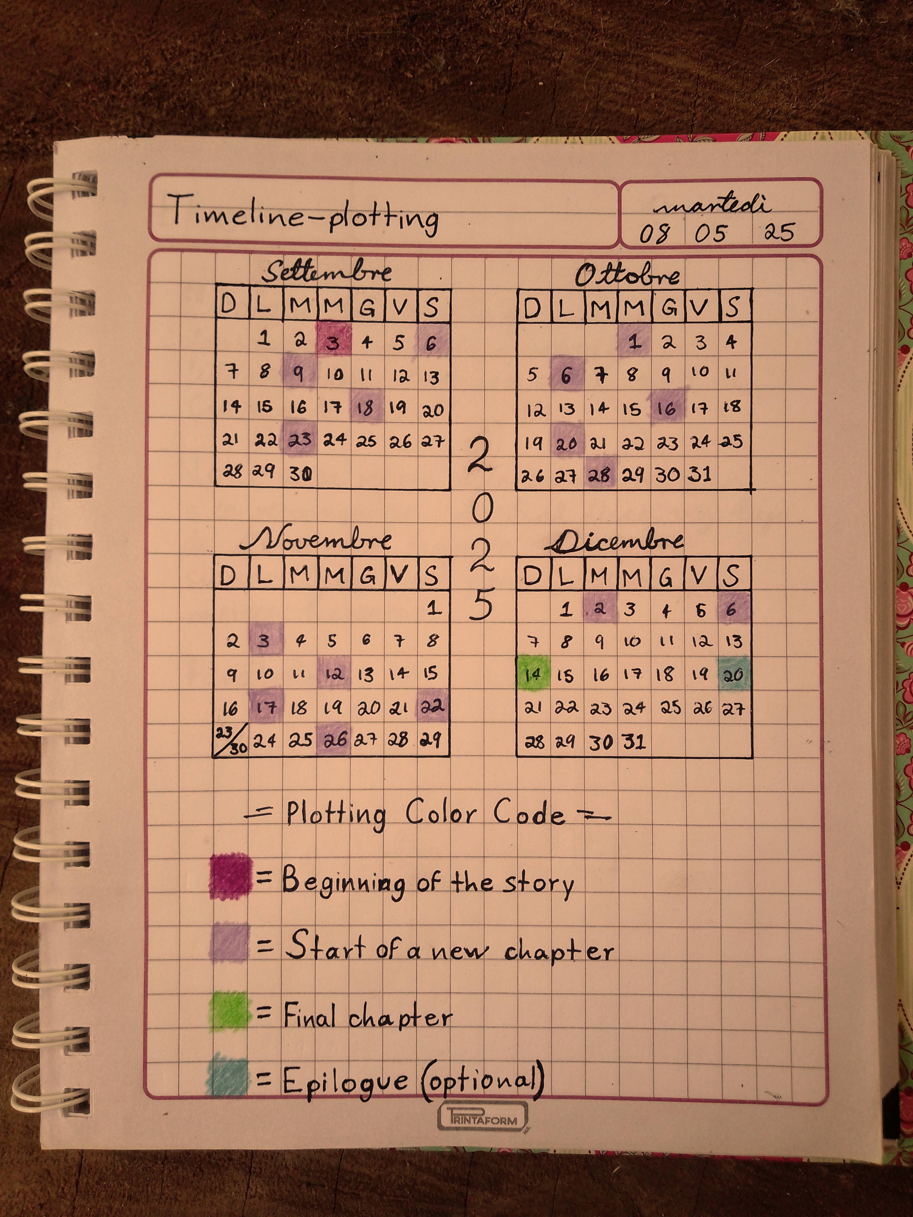 If you’re not someone who does detailed chapter planning—like me—don’t worry. You can adapt. For example, once you’ve assigned meaning to your colors, you can make notes on another sheet of paper and mark the important points on your timeline at the same time as you associate those notes with the dates on your calendar. The core of the method remains the same: color + meaning. From there, you can modify it as much as you need. The only thing to remember is that the system should adapt to you, not the other way around. If something isn’t helping you, discard it and find another approach. Don’t confine yourself to a box if you have the freedom to fly.